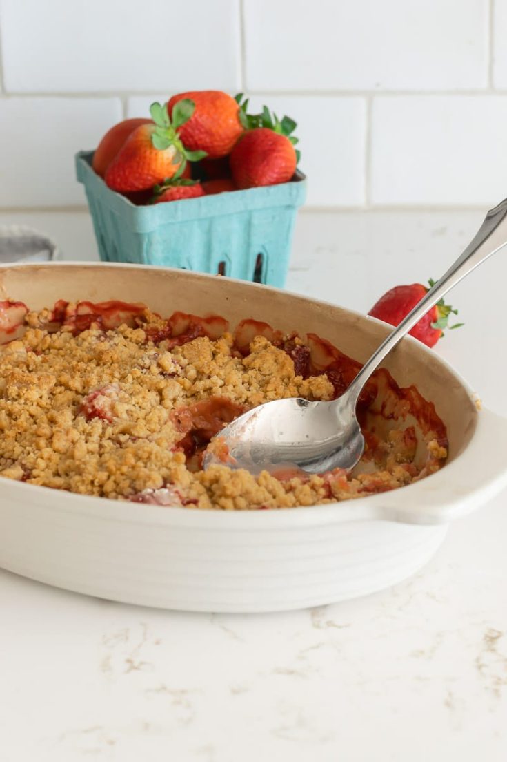 And second, make the topping ahead of time and refrigerate it. Top the berries with the topping right before you pop your Strawberry Crumble Recipe into the oven. These two tips will produce a crispy topping that pairs perfectly with the cooked strawberries.