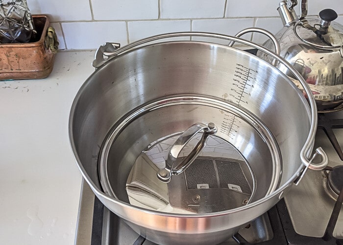 - If you will be canning the jam, Prepare a canner, jars, and lids. Wash your jars and lids. Sterilize your jars in a large pot filled with water. Bring the water to almost a simmer over medium heat. Keep the jars in the simmering water until you are ready to fill them. Use a jar lifter to remove them from the water when you are ready to fill them, dumping the hot water back into the pot when you remove each jar from the water. Right before you are ready to can, put your lids in a small pot or bowl with hot, but not boiling, water. Put some additional white vinegar in a small bowl alongside a clean washcloth or paper towel. Keep the water in your canning pot at a simmer while you fill your jars. See The The All New Ball Book of Canning and Preserving for additional guidance.