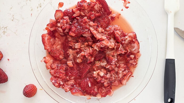 - Working in batches, place some strawberries into a bowl or pie plate and use a potato masher, large spoon, or the bottom of a glass to mash the berries. (No matter how careful you are, you will likely get strawberry juice sprayed on yourself. Dress appropriately!)