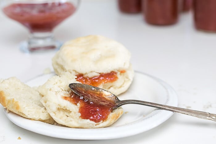 Enjoy this delightful Strawberry Rhubarb jam on biscuits, toast, scones, or in your next Peanut Butter and Jelly sandwich. This jam also makes a great gift, especially when paired with a little spoon. I keep my eyes open for sweet small spoons when I am at Goodwill or an antique store.