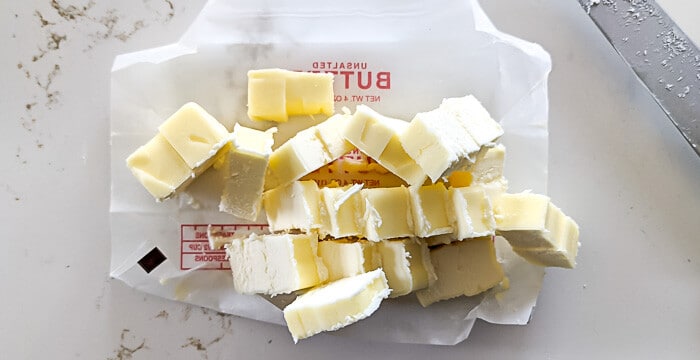 - Cut the butter into 1/2 inch (ish) pieces and put back in the freezer. I find this the best way to get the cold butter that makes this recipe successful.