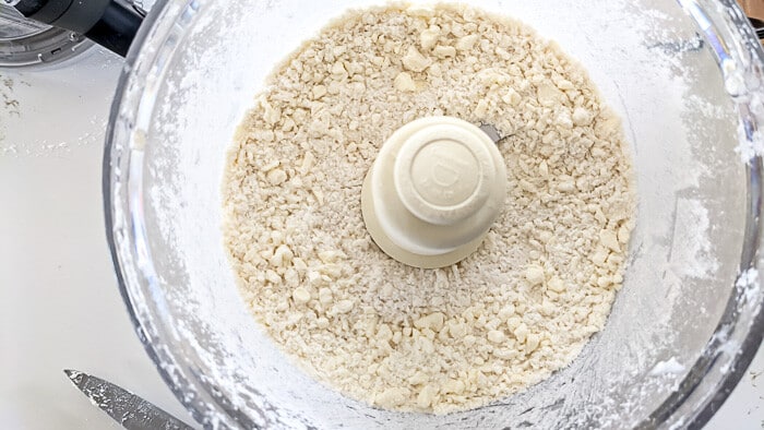 - If using a food processor, add the butter all at once and pulse to combine. You will want it to look like coarse cornmeal with larger butter pieces no bigger than a pea. If not using a food processor, using a pastry cutter or two knives, cut the butter into the flour mixture until it resembles coarse cornmeal with the larger butter pieces no bigger than a pea.