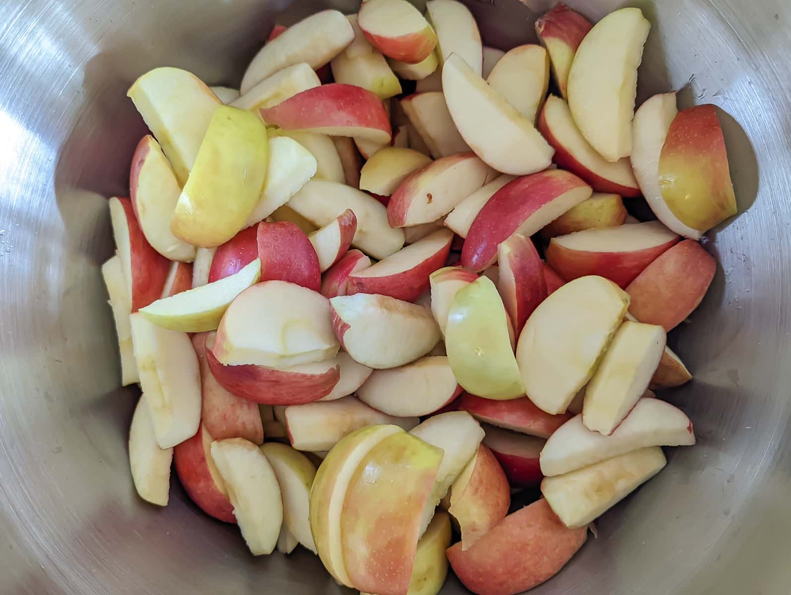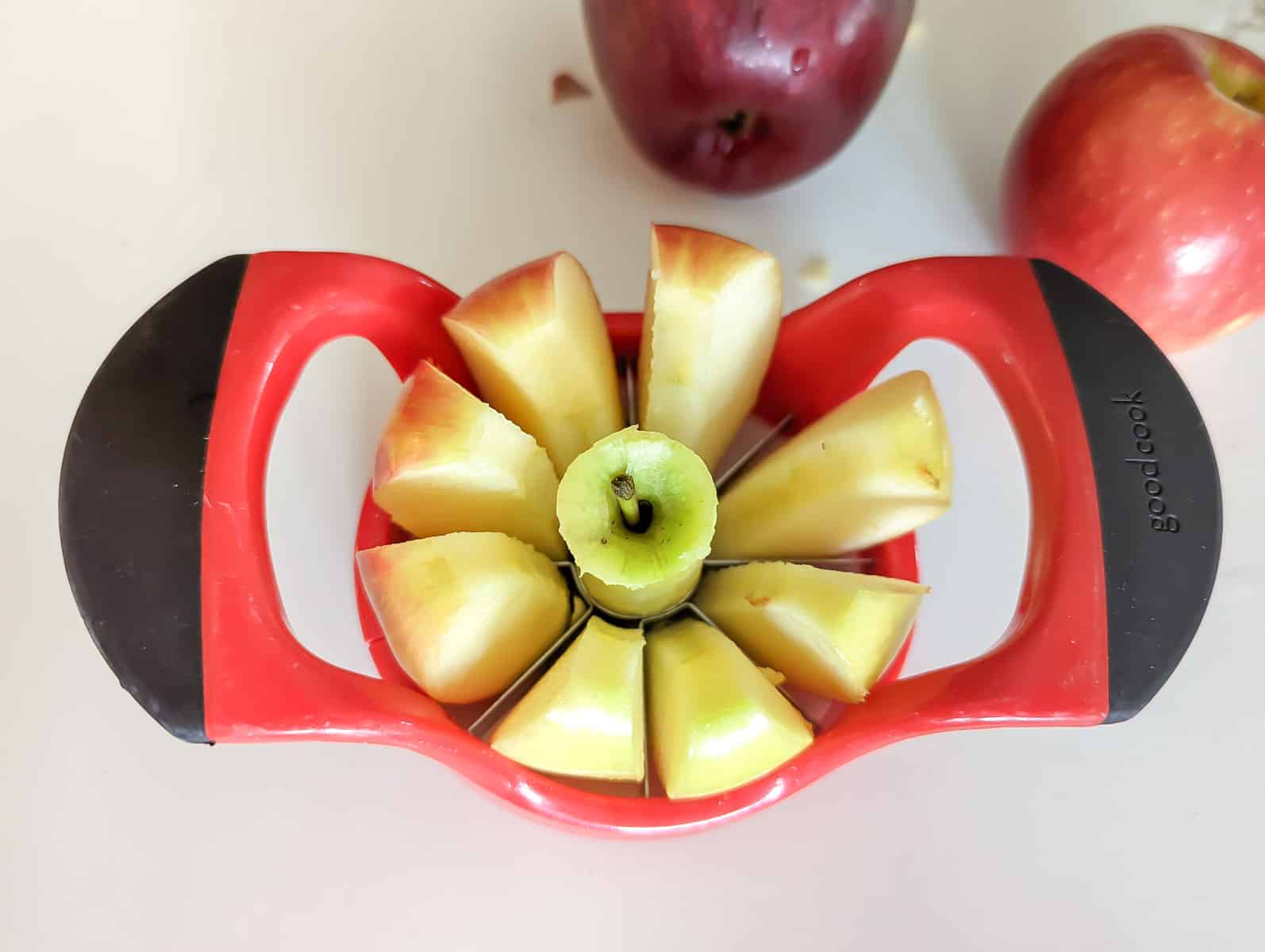 - Cut apples into quarters or eighths. I use our apple cutter, which cuts the apple into eighths and removes the core. There is no need to peel the apples.