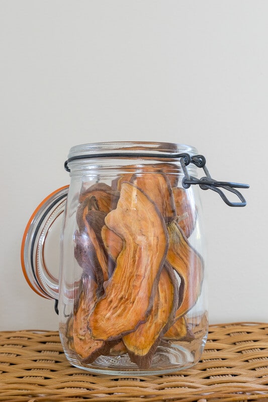 Truly, it’s just a matter of slicing your sweet potatoes and drying/dehydrating them in either your dehydrator or your oven. That being said, the thickness with that you slice them is important. Too thin, you end up with sweet potato chips, and too thick, and you have sweet potato leather/rubber.