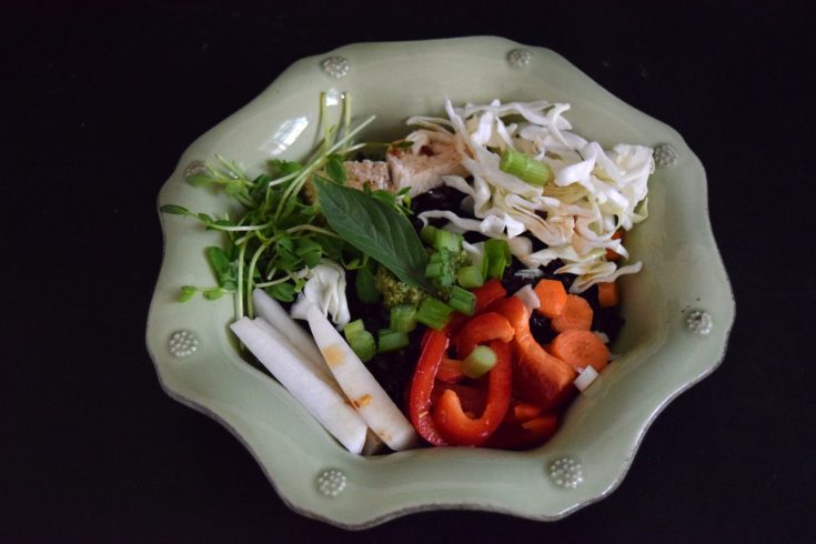 Well…we were so eager to dive in to this succulent and fragrant chicken that I completely forgot about the Thai basil. So then, I ended up with a fresh bunch of Thai basil that needed to be used. DARN…guess we need to have another Thai meal soon so it doesn’t go to waste! Enter the Thai Black Rice Bowl.
