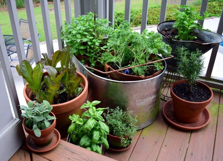 I keep a small container herb garden on my back deck, just outside my kitchen door. Not that it’s the north 40, but my ‘real’ garden is a bit of a farther hike, so it’s nice to have the herbs I use frequently in easy reach. During the fall and winter months, when the tender herbs like basil succumb to the weather, I plant lettuce and kale in some of the pots.